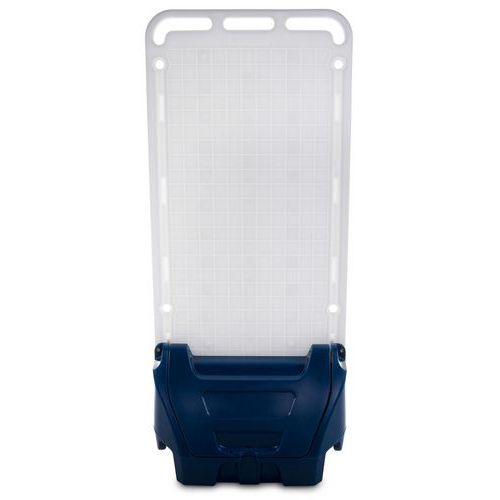 Expositor móvel personalizável. Utilização possível em espaços interiores e exteriores. Deslocação fácil graças às pegas ergonómicas. Manutenção, montagem e desmontagem fáceis. Material de elevada resistência a raios UV e produtos químicos. Tampa inclinada: escoamento simples da água da chuva. 2 rodas robustas de Ø 200 mm. Painel com 1220 mm de altura. Caixa com abertura a 98° e 505 mm de altura.