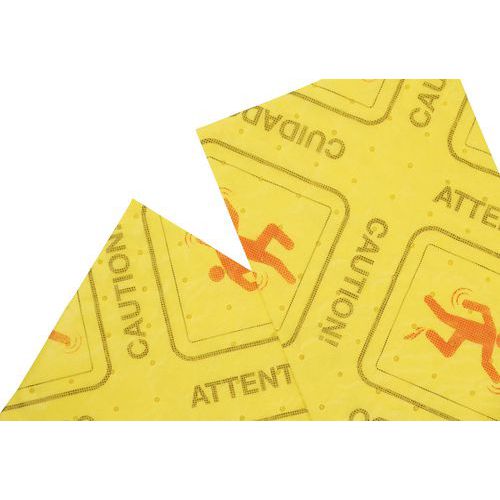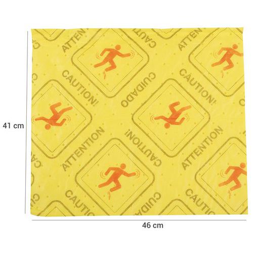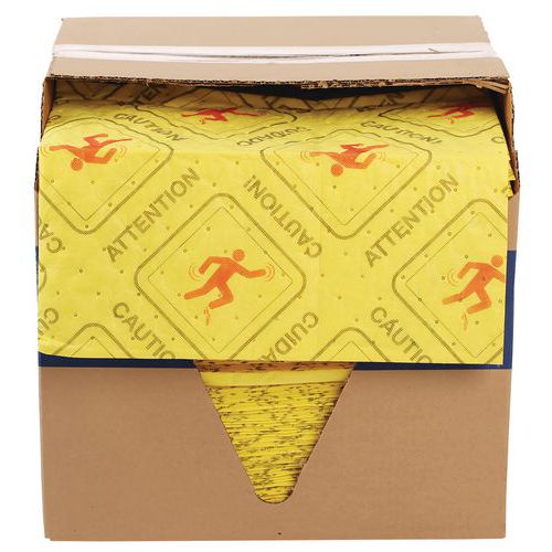 Absorvente com mensagem de aviso para dupla segurança. Limpa os líquidos e evita os riscos de escorregar. As cores de alta visibilidade e o pictograma de segurança incitam à vigilância. Grande capacidade de absorção de líquidos industriais não químicos. Ideal para zonas muito movimentadas onde existem riscos de escorregar, tropeçar e cair