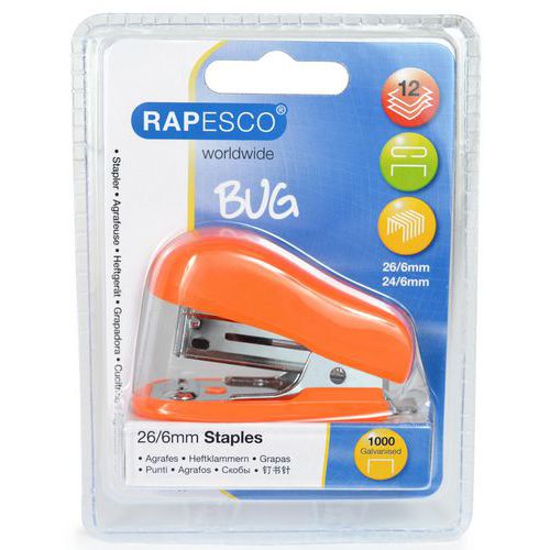 | Nome do artigo | Agrafador pequeno BUG 24/6 – laranja – 12 folhas – Rapesco, Cap. de agrafagem (Número de folhas): 12 |
