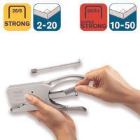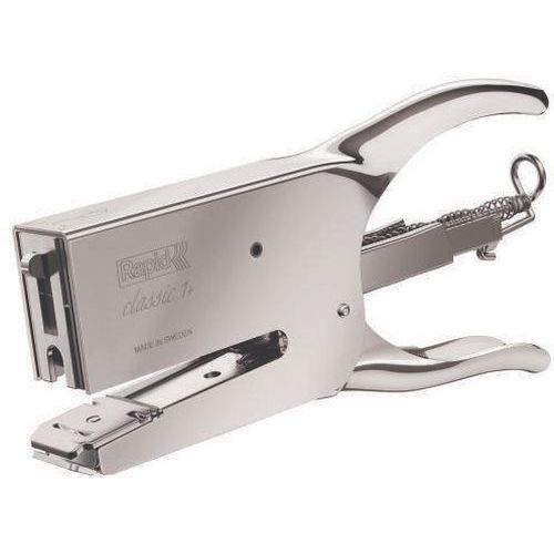 Agrafador Classic K1 cromado Prático: agrafar e pregar documentos. Permite-lhe agrafar vários documentos de uma só vez graças a um mecanismo em aço robusto e fiável. Com dupla função de agrafar/pregar, permite-lhe ajustar a placa de acordo com as suas necessidades para uma fixação temporária ou permanente. Carregamento posterior prático, substitua facilmente os seus agrafos Rapid n.º 26 (26/6 Strong ou 26/8 Superstrong) para uma poupança de tempo ideal.