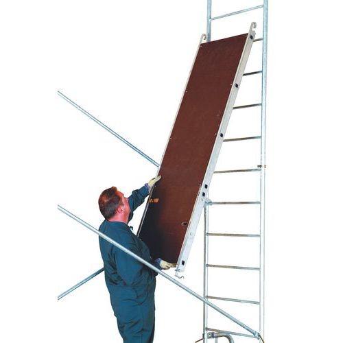 - Plataforma com portinhola em alumínio e madeira, modificável em intervalos de 250 mm.
