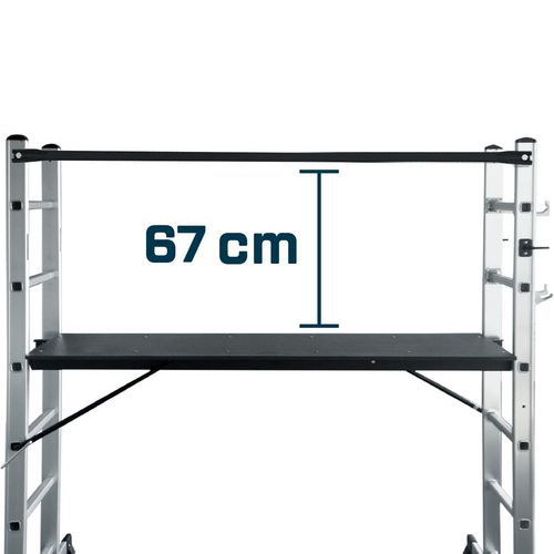 O andaime Multi Brico oferece uma elevada versatilidade: a combinação de andaime/escada num único produto, utilizável em solo plano ou em compensação de nível! Como andaime, a montagem é rápida (menos de 6 minutos). Desfrute do máximo conforto com uma plataforma antiderrapante em madeira XL. Para sua segurança, está equipado com uma balaustrada de segurança alta ajustável e bases estabilizadoras com calços antiderrapantes. Montagem rápida: menos de 6 minutos. Confortável: plataforma antiderrapante em madeira XL de 147,5 x 40,5 cm. Estável: bases estabilizadoras com calços antiderrapantes. Resistente: fixação dos degraus através de engaste impossível de desmontar e não deformável. Em alumínio/aço.