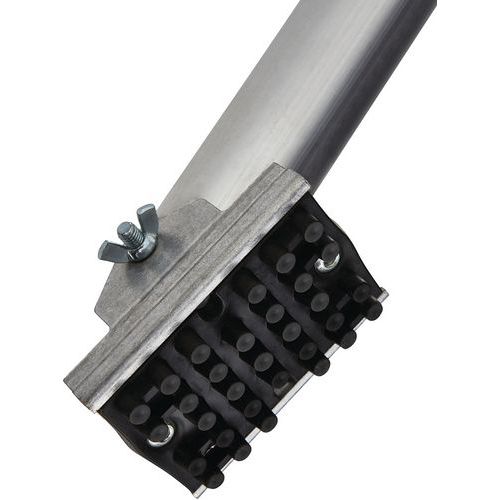 Andaime rolante, estrutura em alumínio soldado, balaustrada de segurança com travessa dupla. Rodapés postiços amovíveis em alumínio (150 mm) de colocação rápida. Placa de estabilização antiderrapante e orientável com compensação de nível integrada. Rodas com bloqueio extraforte e regulação milimétrica até 200 mm em intervalos de 12,5 mm. Sistema de ligação patenteado Ergoblock® para um bloqueio ultrafiável num só gesto. Plataforma de tipo R08 Comabi.