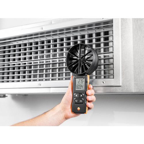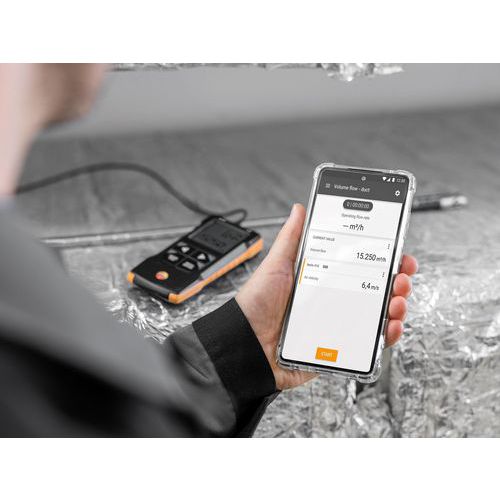 Medição simples, rápida e precisa do fluxo, do débito volumétrico e da temperatura nas entradas e saídas de ar. Ajuste eficaz da ventilação mecânica controlada e documentação rápida com a aplicação Testo Smart. Configuração rápida na aplicação, curva gráfica, segundo ecrã e memória de dados de medição na aplicação testo Smart. Cálculo das médias temporais e multipontos.