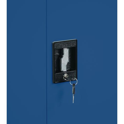 Armário alto monobloco com portas rebatíveis. Inclui prateleiras com capacidade de carga de 40 kg adequadas para armazenamento geral. Revestimento de proteção com acabamento resistente e fácil de limpar. Fechadura cilíndrica integrada com duas chaves incluídas. Produto fabricado em aço soldado para maior durabilidade. Estrutura cinzento-clara RAL 7035 com acabamento em epóxi. Portas azuis RAL 5009. Instruções de montagem completas incluídas no kit rebatido.
