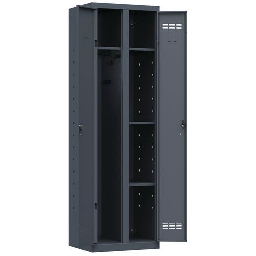 Cacifo multiusos de 2 portas. Composto por uma parte com guarda-roupa e outra com espaço de arrumação. Gama moderna que alia qualidade, segurança e design. Soldado em fábrica para garantir a máxima robustez. Elevada resistência ao arrombamento. Recomendações de segurança: - Instalar o móvel numa superfície plana - Fixá-lo numa parede ou divisória, com uma fixação adequada - Ter atenção para não ultrapassar a carga máxima recomendada, assim como a distribuição correta