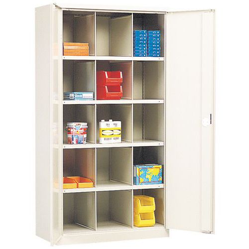 Armário com compartimentos fornecido completo com prateleiras lacadas e divisórias metálicas reguláveis.