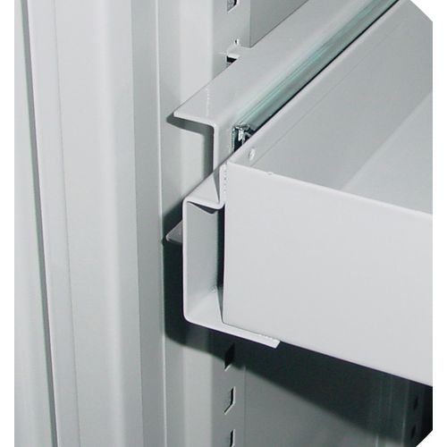 Caixa de retenção em aço na parte inferior do armário, com 80 mm de altura, montada em calhas deslizantes.
