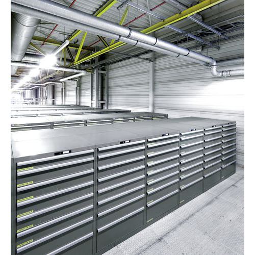 A elevada estabilidade da estrutura tem capacidade para até 4 t, as gavetas têm capacidade para até 75 ou 200 kg Utilização ideal graças à extensão total e à altura frontal ideal das gavetas Excelente proteção contra pó, líquidos e desgaste mecânico graças a uma estrutura fechada com superfície resistente a impactos e à abrasão Segurança a toda a prova, proteção contra o desengate que impede a queda da gaveta e o bloqueio individual das gavetas (sistema antibasculamento) Proteção contra corrosão com tinta de imersão em eletroforese e tinta em spray Armazenamento e organização otimizados graças ao material da subdivisão LISTA adaptado a cada aplicação e às gavetas com ranhuras e perfurações Etiquetagem profissional com software de etiquetagem LISTA Script e barra de preensão rebatível para inserção de etiquetas Movimento perfeitamente silencioso graças à calha sem travessa
