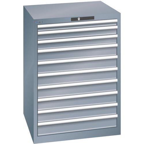 Armário com 10 gavetas 36x36E com capacidade para suportar até 75 kg. Utilização ideal graças à extensão total e à altura frontal ideal das gavetas. Excelente proteção contra poeiras, líquidos e desgaste mecânico graças a uma estrutura fechada com superfície resistente a impactos e à abrasão. Segurança a toda a prova, proteção contra o desengate que impede a queda da gaveta e o bloqueio individual das gavetas (sistema antibasculamento). Proteção contra corrosão com tinta de imersão em eletroforese e tinta em spray.