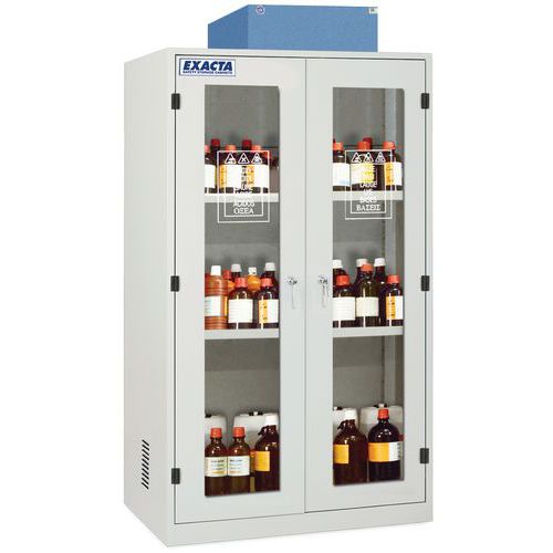 Armário de segurança robusto, totalmente construído em chapa de aço eletrogalvanizada com espessura de 15/10 mm, dobrado a frio. 4 portas rebatíveis com paredes duplas em vidro Securit de 6 mm. Fecho com chave. A abertura da porta num ângulo de 110° permite retirar prateleiras sem as inclinar. Equipado com bloco de ventilação com filtro em conformidade com a norma AFNOR NFX 15-211.