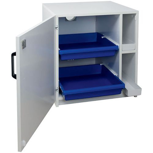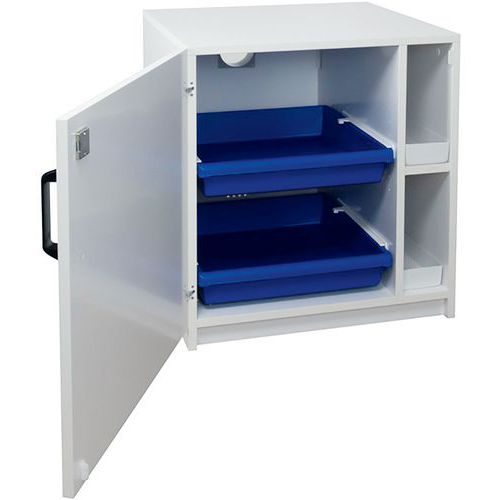 Armário de segurança compartimentado que permite a separação dos ácidos e das bases. Equipado com pés reguláveis para nivelação. Caixas de retenção em polipropileno em calhas deslizantes. Construção resistente às agressões dos vapores corrosivos. Orifícios de ventilação para permitir a ligação a um ventilador. Em conformidade com as recomendações do INRS. Fabricado na UE