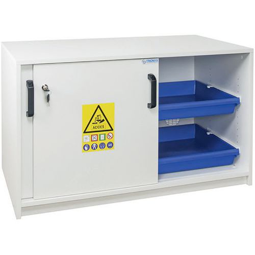 Armário de segurança compartimentado que permite a separação dos ácidos e das bases. Equipado com pés reguláveis para nivelação. Caixas de retenção em polipropileno em calhas deslizantes. Construção resistente às agressões dos vapores corrosivos. Orifícios de ventilação para permitir a ligação a um ventilador. Em conformidade com as recomendações do INRS.