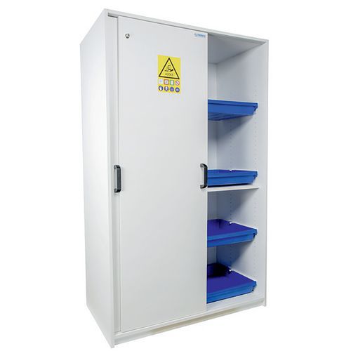 Armário de segurança compartimentado que permite a separação dos ácidos e das bases. Equipado com pés reguláveis para nivelação. Caixas de retenção em polipropileno em calhas deslizantes. Construção resistente às agressões dos vapores corrosivos. Orifícios de ventilação para permitir a ligação a um ventilador. Em conformidade com as recomendações do INRS.