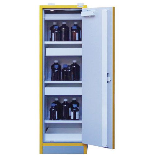 Armário de segurança multirriscos em conformidade com a norma EN 14470-1. Possui uma resistência ao fogo de 30 minutos. Contém compartimentos que permitem separar os produtos químicos incompatíveis. Fecho com chave em 3 pontos e fechadura antifaíscas. Orifícios de ventilação para permitir a ligação a um ventilador. Juntas de porta termodilatantes Pés reguláveis para nivelação Condutas de ventilação com sistema termofundível. Testado e homologado em conformidade com a norma FM 6050.