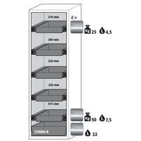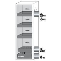 Armazenamento seguro de produtos perigosos inflamáveis nas áreas de trabalho de acordo com as normas aplicáveis Robusto e durável: estrutura exterior sólida feita de placas ignífugas revestidas com resina de melamina 3 dobradiças de fixação de porta mecanismo de fecho completo e elementos de segurança protegidos contra a corrosão montados fora da área de armazenamento porta de qualidade resistente a riscos com superfície estruturada revestida a epóxi Ergonómico: a porta mantém-se em posição quando aberta fecho automático em caso de incêndio Utilização controlada: porta com fechadura compatível com sistema de fecho central Transporte fácil: base de transporte integrado em opção rodapé de acabamento simples ou rodapé rematado com 4 pés niveladores Arejamento e ventilação: sistema de arejamento e ventilação integrados para ligação (diâmetro 75 mm) a um sistema técnico de exaustão de ar Testado e certificado: em conformidade com a norma americana FM 6050
