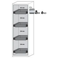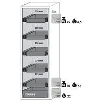 Armazenamento seguro de produtos perigosos inflamáveis nas áreas de trabalho de acordo com as normas aplicáveis Robusto e durável: estrutura exterior sólida feita de placas ignífugas revestidas com resina de melamina 3 dobradiças de fixação de porta mecanismo de fecho completo e elementos de segurança protegidos contra a corrosão montados fora da área de armazenamento porta de qualidade resistente a riscos com superfície estruturada revestida a epóxi Ergonómico: a porta mantém-se em posição quando aberta fecho automático em caso de incêndio Utilização controlada: porta com fechadura compatível com sistema de fecho central Transporte fácil: base de transporte integrado em opção rodapé de acabamento simples ou rodapé rematado com 4 pés niveladores Arejamento e ventilação: sistema de arejamento e ventilação integrados para ligação (diâmetro 75 mm) a um sistema técnico de exaustão de ar Testado e certificado: em conformidade com a norma americana FM 6050 Fabricado na Alemanha