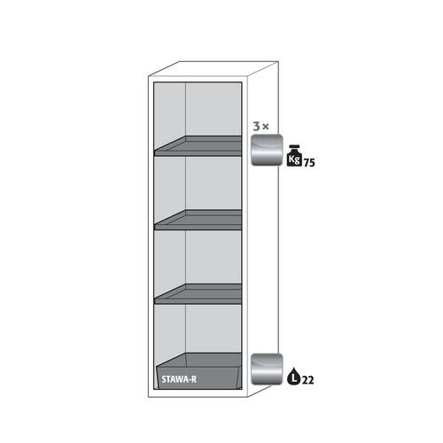 Armazenamento seguro de produtos perigosos inflamáveis nas áreas de trabalho de acordo com as normas aplicáveis Robusto e durável: estrutura exterior sólida feita de placas ignífugas revestidas com resina de melamina 3 dobradiças de fixação de porta mecanismo de fecho completo e elementos de segurança protegidos contra a corrosão montados fora da área de armazenamento porta de qualidade resistente a riscos com superfície estruturada revestida a epóxi Ergonómico: a porta mantém-se em posição quando aberta fecho automático em caso de incêndio Utilização controlada: porta com fechadura compatível com sistema de fecho central Transporte fácil: base de transporte integrado em opção rodapé de acabamento simples ou rodapé rematado com 4 pés niveladores Arejamento e ventilação: sistema de arejamento e ventilação integrados para ligação (diâmetro 75 mm) a um sistema técnico de exaustão de ar Testado e certificado: em conformidade com a norma americana FM 6050