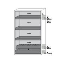 Armazenamento seguro de produtos perigosos inflamáveis nas áreas de trabalho de acordo com as normas aplicáveis Robusto e durável: estrutura exterior sólida feita de placas ignífugas revestidas com resina de melamina 3 dobradiças de fixação de porta mecanismo de fecho completo e elementos de segurança protegidos contra a corrosão montados fora da área de armazenamento porta de qualidade resistente a riscos com superfície estruturada revestida a epóxi Ergonómico: a porta mantém-se em posição quando aberta fecho automático em caso de incêndio Utilização controlada: porta com fechadura compatível com sistema de fecho central Transporte fácil: base de transporte integrado em opção rodapé de acabamento simples ou rodapé rematado com 4 pés niveladores Arejamento e ventilação: sistema de arejamento e ventilação integrados para ligação (diâmetro 75 mm) a um sistema técnico de exaustão de ar Testado e certificado: em conformidade com a norma americana FM 6050 Fabricado na Alemanha Fabricado na Alemanha