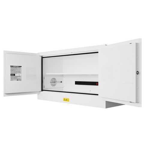 O aço soldado de parede dupla proporciona uma estrutura sólida que permite conter potenciais explosões. O sistema de ventilação de descompressão com filtro integrado retém o fumo e absorve as toxinas nocivas. As placas de bloqueio das portas em aço reforçado garantem que as portas do armário permanecem fechadas. Os dispositivos de proteção contra chamas nas dobradiças da porta evitam incêndios secundários no exterior do armário. Os amortecedores de mola reduzem a libertação de fumo e de gases nocivos quando a temperatura do armário atinge 135 °F.