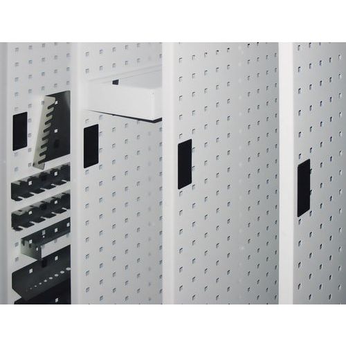 Com painéis para ferramentas perfurados totalmente extraíveis.