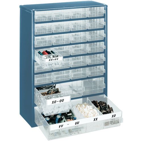 Guarde os seus objetos ao abrigo do pó. Combine facilmente vários armários. Gavetas corrediças sólidas com puxadores inquebráveis. O armário em aço pode ser colocado no chão ou suspenso na parede. Fabricado na UE Carga máx. (kg) : 45 kg Garantia do cliente : 3 anos