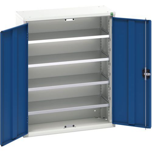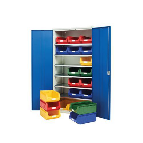 Portas reforçadas, fecho com ferrolho de 3 pontos Prateleiras em aço galvanizado, capacidade de carga de 60 kg Inclui caixas na cor apresentada Dimensões das caixas (CxPxA mm): n.º 3 – 145 x 240 x 125, n.º 5 – 303 x 485 x 190