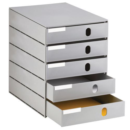 Módulo de arquivo com 5 gavetas Styroval pro eco duradouro com dimensões externas estreitas (243 mm de largura). Adequado para armários e prateleiras. Disponível com gavetas corrediças abertas ou fechadas, para arquivar até ao formato C4. O Styroval pro eco é um sistema de arquivo com dimensões exteriores mínimas em comparação com o volume interior das gavetas. Utiliza o espaço disponível da melhor forma O Styroval é essencial onde todo o espaço importa.