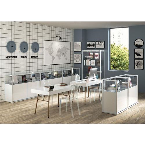Aresta frontal sem perfil metálico para uma melhor visibilidade. Com reguladores para nivelação no solo. Vitrina tipo balcão entregue montada.