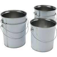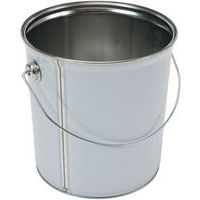 - Balde metálico com asa em metal e tampa plana.