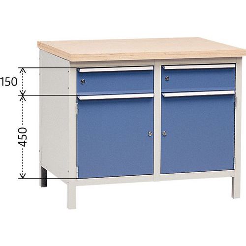 Bancada equipada com um armário de porta bloqueável para mais espaço de armazenamento em segurança.