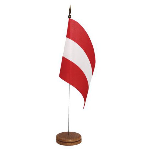 Bandeira de mesa em material de têxtil e poliéster com impressão frontal e verso espelhado. Bandeira fixa em haste metálica com ponta em plástico. Acabamento com corte limpo: sem bainha. Fabricado na UE Garantia do cliente : 3 anos