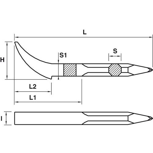 - Octogonal ou redonda, com lâmina curva e pontiaguda.