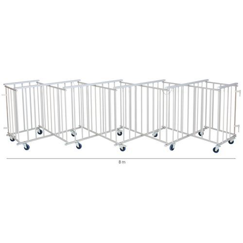 Barreira extensível autoportante e robusta. Suporta fortes pressões: adequada para todos os eventos que atraiam público (eventos desportivos e culturais, concertos, salões, estádios, parques de diversões…). Simples de utilizar e armazenar: colocação fácil e rápida. Move-se por meio de rodízios e estabiliza-se em 5 segundos. Bloqueio dos rodízios: basta pressionar o travão. Eixo e parafusos em inox: resiste às intempéries sem riscos de ferrugem. Os rodízios são compostos por: rodas de borracha em azul, chapas em aço zincado, embutidos e rodas giratórias.