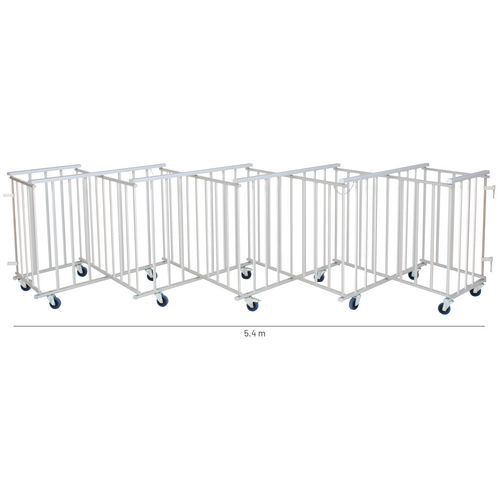 Barreira extensível autoportante e robusta. Suporta fortes pressões: adequada para todos os eventos que atraiam público (eventos desportivos e culturais, concertos, salões, estádios, parques de diversões…). Simples de utilizar e armazenar: colocação fácil e rápida. Move-se por meio de rodízios e estabiliza-se em 5 segundos. Bloqueio dos rodízios: basta pressionar o travão. Eixo e parafusos em inox: resiste às intempéries sem riscos de ferrugem. Os rodízios são compostos por: rodas de borracha em azul, chapas em aço zincado, embutidos e rodas giratórias. Fabricado na UE
