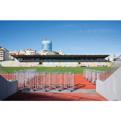 Barreira extensível autoportante e robusta. Suporta fortes pressões: adequada para todos os eventos que atraiam público (eventos desportivos e culturais, concertos, salões, estádios, parques de diversões…). Simples de utilizar e armazenar: colocação fácil e rápida. Move-se por meio de rodízios e estabiliza-se em 5 segundos. Bloqueio dos rodízios: basta pressionar o travão. Eixo e parafusos em inox: resiste às intempéries sem riscos de ferrugem. Os rodízios são compostos por: rodas de borracha em azul, chapas em aço zincado, embutidos e rodas giratórias.