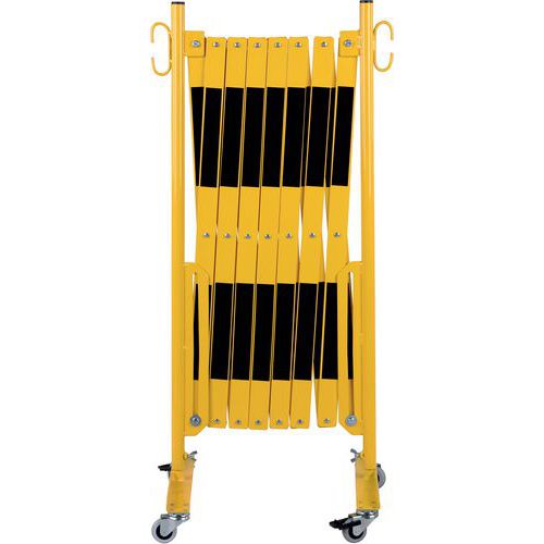 Barreira extensível em aço com rodízios e fixação mural para delimitação temporária. Faixas em duas cores para maior visibilidade. Indicada apenas para utilização em espaços interiores. Fácil de manusear, armazenar e utilizar graças aos rodízios com travão. Certificação TÜV.
