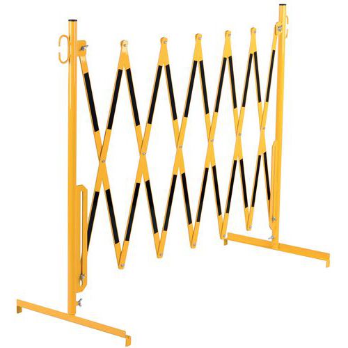 Barreira extensível em aço com pés dos 2 lados que permitem o bloqueio temporário de uma zona perigosa. A alternância de cores chama a atenção dos utilizadores e sinaliza os perigos. Possibilidade de união de várias barreiras entre si. Ocupa pouco espaço quando dobrada. Certificação TÜV.