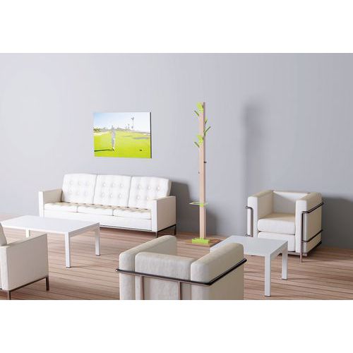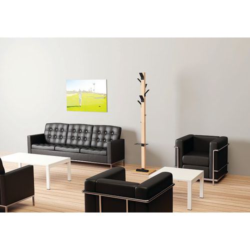6 ganchos para vestuário em poliestireno antichoque de elevada resistência. 2 ganchos para acessórios, em aço cromado. Bidão em faia maciça, secção de 60 mm x 60 mm. Base em contraplacado de 35 cm x 35 cm, espessura de 20 mm.