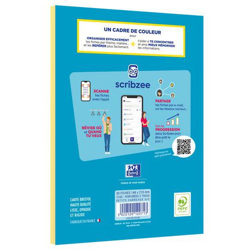 Uma moldura colorida permite organizar eficazmente os seus cartões por tema e material. Mantém a legibilidade das suas notas graças ao contraste do fundo branco. Estes cartões estão disponíveis em 4 cores de molduras. A capa do bloco de cartões Bristol envolve e protege os seus cartões. Este formato de bloco de notas permite-lhe transportá-los facilmente na sua mala, sem os danificar. Fabricadas em cartão de 210 g resistente e de alta qualidade, as fichas Bristol OXFORD são suaves e opacas para o conforto da escrita, rígidas para arquivo e armazenamento ao longo do tempo. Tamanho A6 fácil de transportar para qualquer lado.
