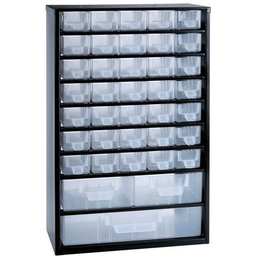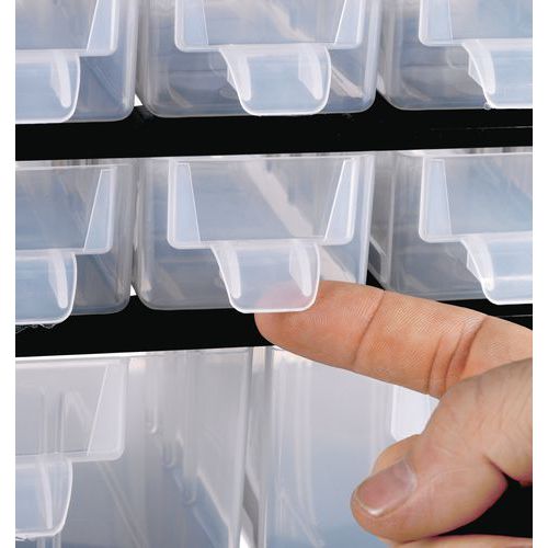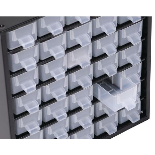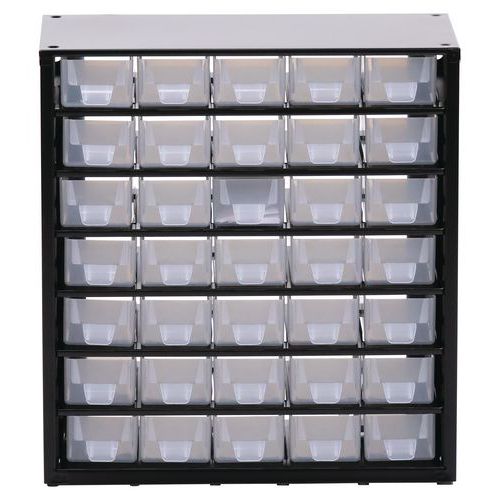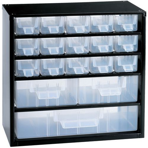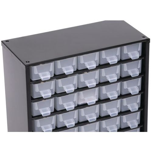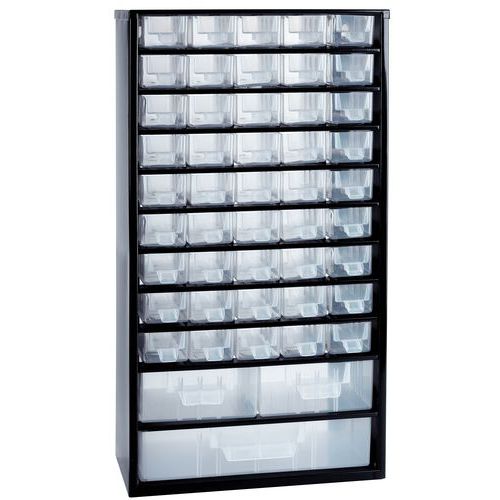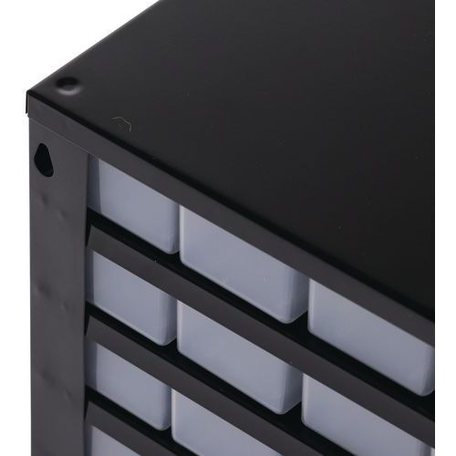 Bloco de compartimentos em metal com gavetas de plástico transparentes. Ideal para guardar, ordenar e organizar peças pequenas. Armazene os seus objetos de forma clara e protegidos de poeiras.