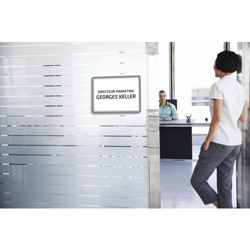 Bolsa para quadro adesivo com impressão dupla face e design pontilhado. Fecho com 3 fitas adesivas: retenção perfeita do documento. Afixação dupla face em vidro, graças ao quadro frente e verso. Utilização com dupla orientação: vertical ou horizontal. Bolsa específica para grandes formatos. Fabricado na UE
