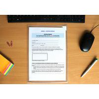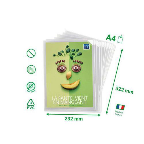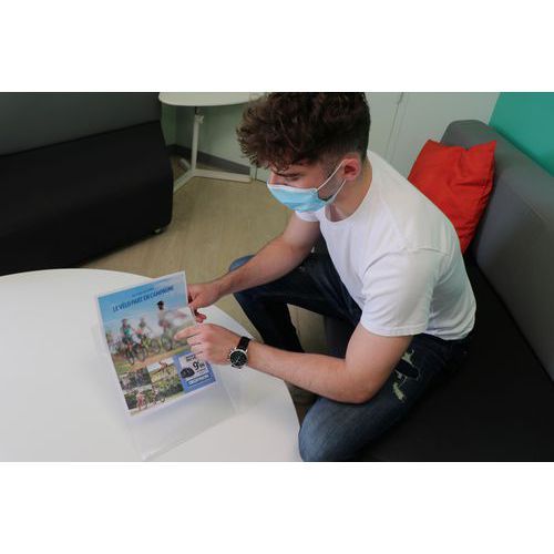 Bolsa de informação antirreflexo com adesivo reposicionável. Contém iões de prata, um agente microbiano natural que destrói os microrganismos, como bactérias, bolores, leveduras, vírus e fungos, que se depositem. Mata 99,99% dos micróbios em menos de 2 h (testado em laboratório). Com canto branco com indicação ANTIMICROBIAL. O fecho magnético de canto permite a fixação perfeita dos documentos.