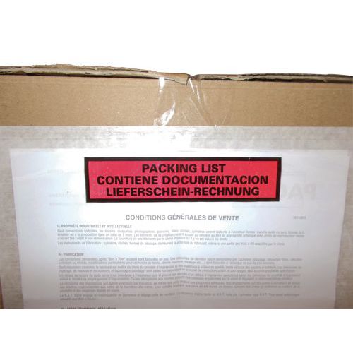 Etiqueta de texto disponível, respetivamente, em inglês, espanhol e alemão: "Packing list - Contiene documentacion - Lieferschein rechnung".