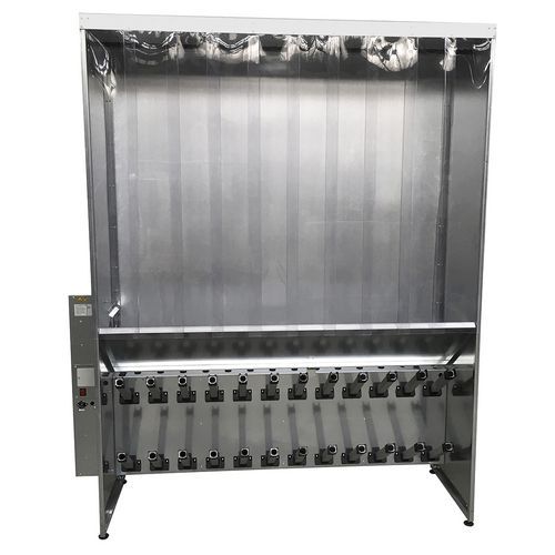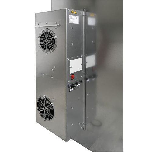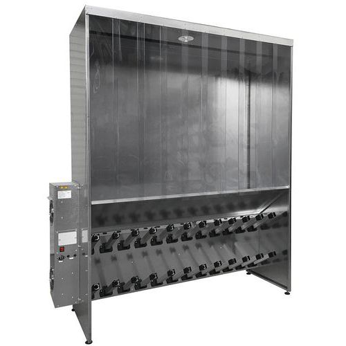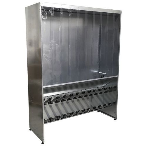 Cabide em aço de estrutura robusta e cuidada, com ar quente pulsado. Grande compartimento alto com vareta em aço para 7 a 12 pessoas. Fecho perfeito assegurado pela porta de lamelas em PVC, bastante isolante. Estrutura baixa com 24 hastes em alumínio fixas para calçado. Secagem otimizada: 2 sistemas de ventilação de elevado débito (700 m3/h, 1600 W). Ideal para o sector da construção civil!