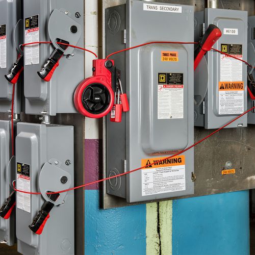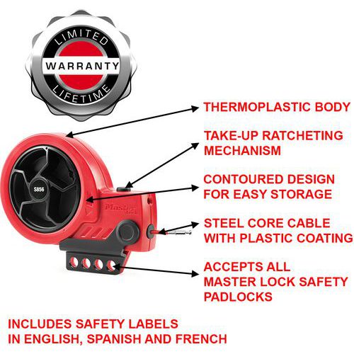 - Dispositivo de bloqueio com cabo retrátil Master Lock, ideal para válvulas e outros sistemas de bloqueio.