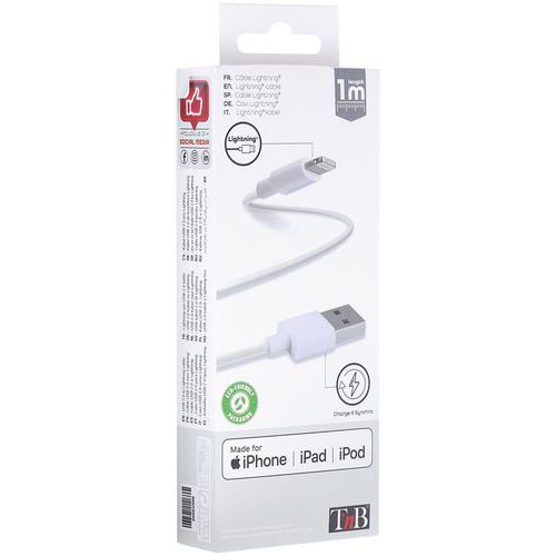 Cabo USB/Lightning – T'nB, Cores: Branco, Embalagem reciclável: Sim - 100%, Comp.: 1 m Cabo USB/Lightning – T'nB, Cores: Branco, Embalagem reciclável: Sim - 100%, Comp.: 1 m