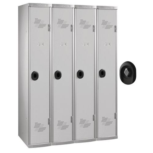 Cacifo em chapa de aço de primeira qualidade com boa rigidez e indeformável. Chapa de aço 6/1e perfilada (equivale à dobragem padrão de 8/1e). Colunas soldadas entre si para maior solidez. Excelente resistência mecânica com perfil fechado através de grampos. Porta impossível de retirar das dobradiças quer esteja aberta ou fechada, antiarrombamento. Articulação com dobradiças com abertura a 180°. Armário cacifo com porta-etiquetas embutido. Alie a resistência, a segurança e a estética nos seus espaços coletivos!