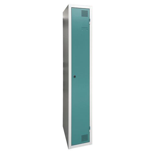 Cacifo com secagem com ar quente pulsado, de grande resistência, com compartimentos e cabides. Corpo e porta em chapa eletrozincada, com ómega de reforço a toda a altura. Utilização confortável com sistema de dobradiças que oferecem uma abertura a 180°. Higiénico, com dupla ventilação na frente, na parte superior e na parte inferior do cacifo. Acabamento elegante em tinta epóxi lacada, numa grande palete de cores atraentes. 2 fechos à escolha: fechadura com chave ou fecho porta-cadeado. Cacifo com porta-etiquetas. Produto fabricado em França.