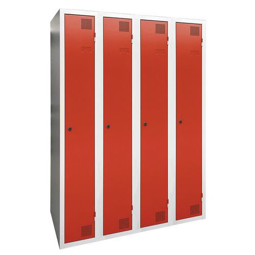 Cacifo com secagem com ar quente pulsado, de grande resistência, com compartimentos e cabides. Corpo e porta em chapa eletrozincada, com ómega de reforço a toda a altura. Utilização confortável com sistema de dobradiças que oferecem uma abertura a 180°. Higiénico, com dupla ventilação na frente, na parte superior e na parte inferior do cacifo. Acabamento elegante em tinta epóxi lacada, numa grande palete de cores atraentes. 2 fechos à escolha: fechadura com chave ou fecho porta-cadeado. Cacifo com porta-etiquetas. Produto fabricado em França.